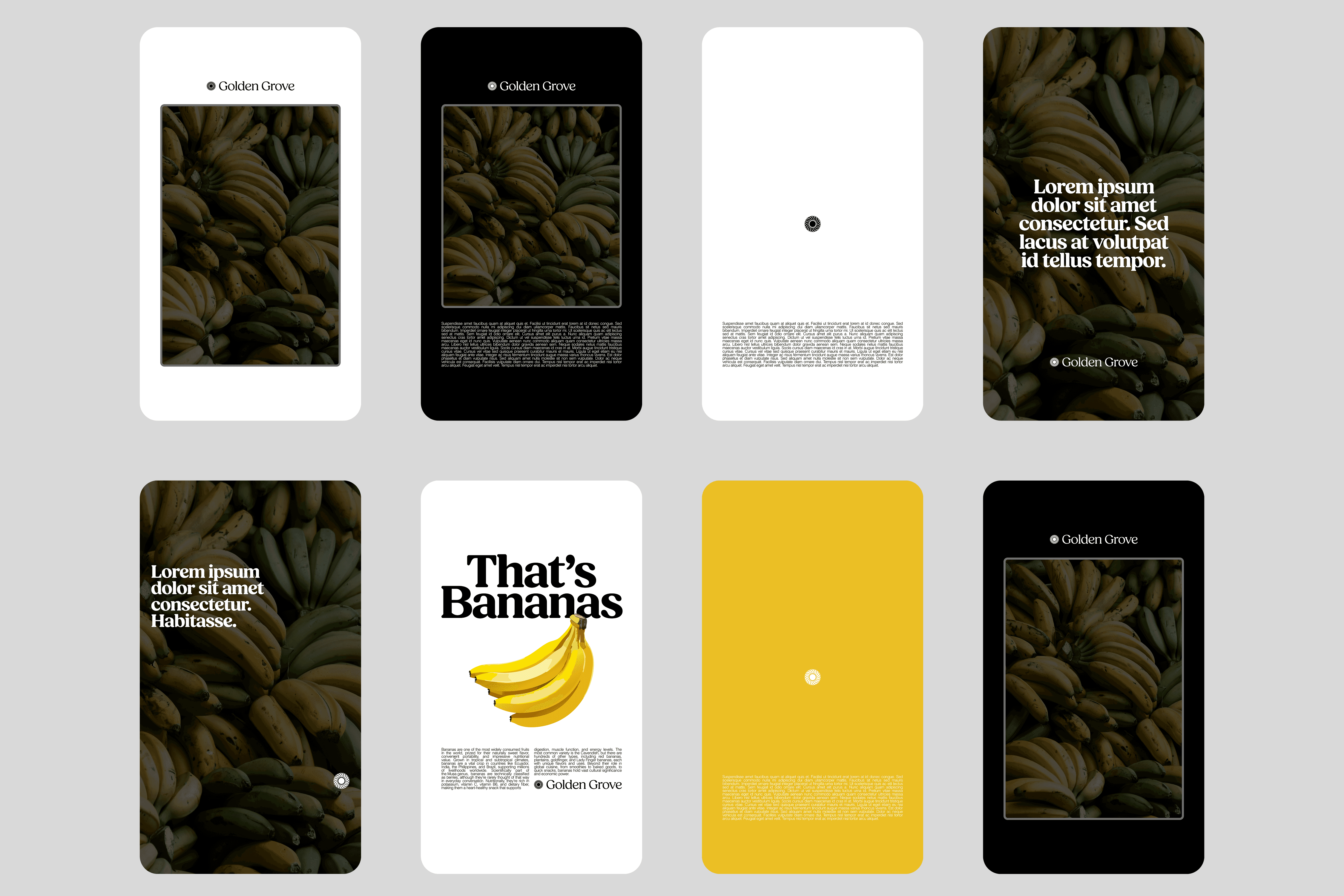 A conceptual spec project exploring brand identity from the ground up. The initial objective was to design a logo that merges the product theme, bananas, with the warmth and symbolism of a golden sun. From that foundation, the project has expanded into a full brand exploration, building out a cohesive visual system across touchpoints including typography, social, packaging, web, email, e-commerce, and apparel. The focus is on how a simple concept can scale into a flexible, recognizable brand world.